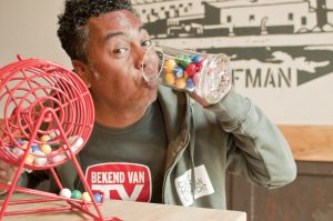 Wat dat is? Dit spel is gebaseerd op de welbekende bingo (of zoals ze het in het zuiden zeggen: kienen). De spelregels zijn simpel. Elke speler heeft een kaart voor zich met verschillende getallen. De bingomaster (ik dus) heeft een bingospel, het rad met de genummerde balletjes. At random valt daar eentje uit en als het nummer erop correspondeert met eentje op je kaart, vink je die af. Vervolgens win je een prijs als je 1 rijtje vol hebt (horizontaal, verticaal of diagonaal), vervolgens twee rijtjes en tenslotte een volle kaart.